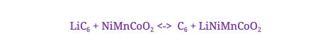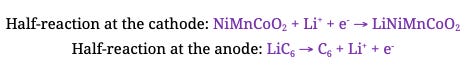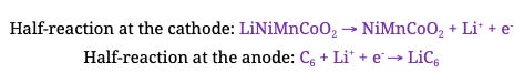 For example, in a Li-ion battery with an NMC cathode and graphite (C6) anode, the half reactions at each electrode while charging would be: