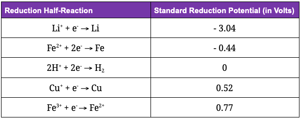 Materials that lose their electrons spontaneously and easily will have a negative standard potential. In the above table, you can see lithium has the highest tendency to lose its electron, making it an ideal material for batteries. Materials that want to hold onto their electron will have a positive standard potential (they require a push of energy to give up their electron).