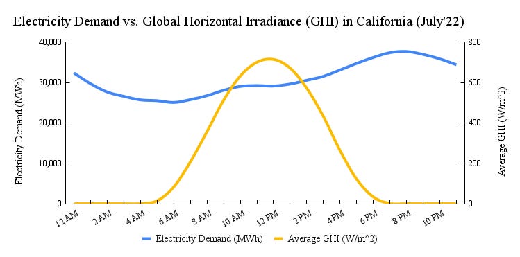 As the world transitions to renewable energy, we’ll need to rely on energy storage technologies like batteries more and more. One frequent criticism of solar and wind-based electricity generation is that it is intermittent -- the energy supply is disrupted at night, on cloudy days, or when there is no wind. For solar energy, this problem is clearly illustrated in the chart below. Solar generation is highest in the middle of the day while energy demand is mismatched, rising in the early morning when people wake up and peaking in the evening when they return from work.