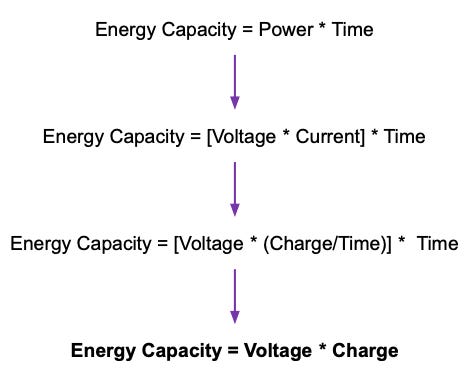 Energy Capacity = Rate of Energy Flow (a.k.a. Power) * (Time to Fully Discharge or Charge).