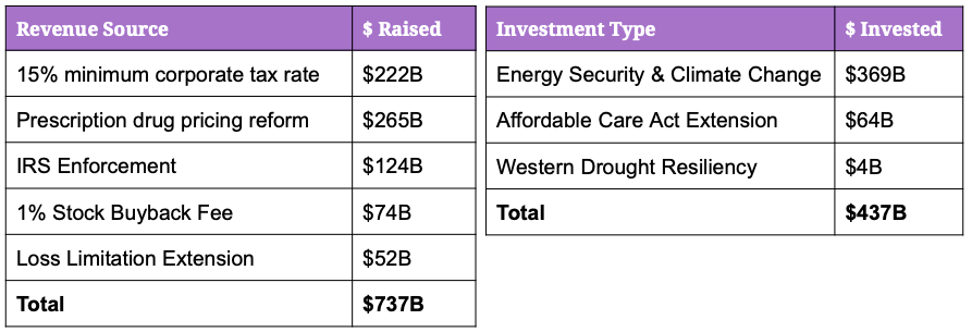 A key feature of the IRA that won Senator Manchin’s vote is its plan to reduce the federal deficit by over $300B. It does this by raising $737B in revenue for the government while investing $437B in energy security and decarbonization, healthcare improvements, and climate change mitigation measures. Here’s a high level breakdown: