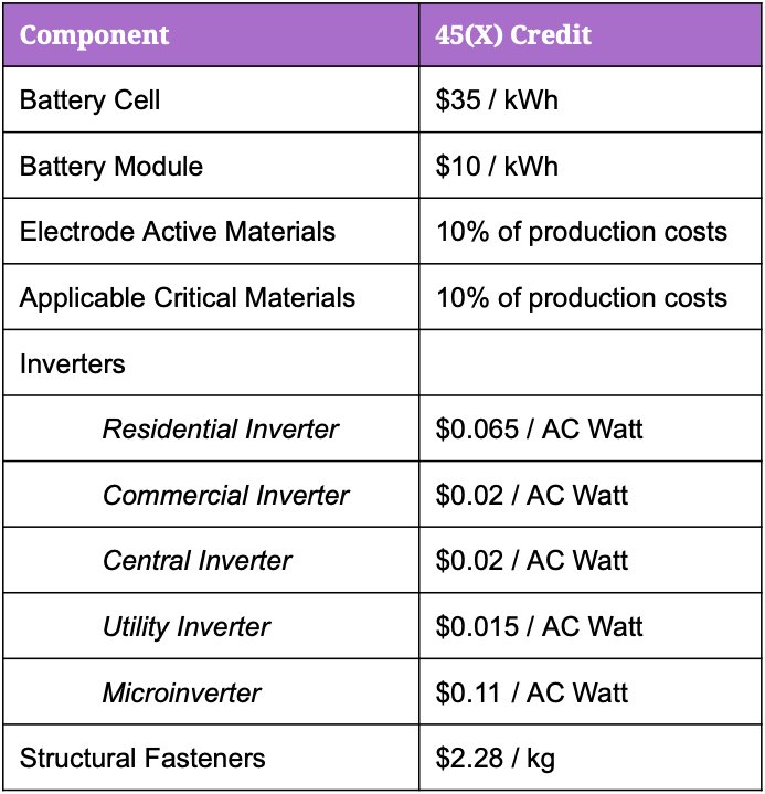 The IRA also introduces a new credit called the Advanced Manufacturing Production Credit (Section 45X), which provides production-volume based tax credits for companies that manufacture eligible energy technology components in the US. These components must be produced by the company and then sold to an “unrelated person.”